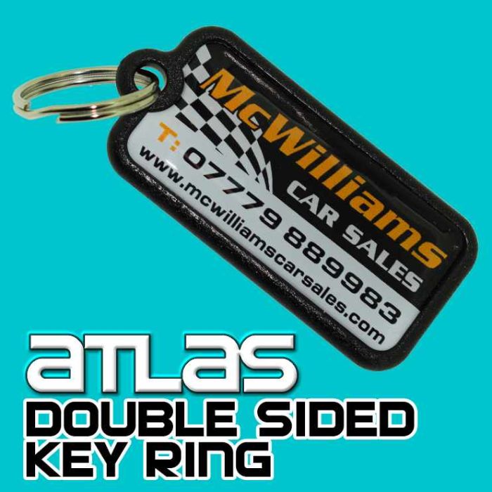 The Atlas is a rectangular black plastic keyring with a durable durable black plastic body and double-sided domed resin label inserts. The generous 55 x 25mm print area is ideal for contact details, logos, and promotional messaging.